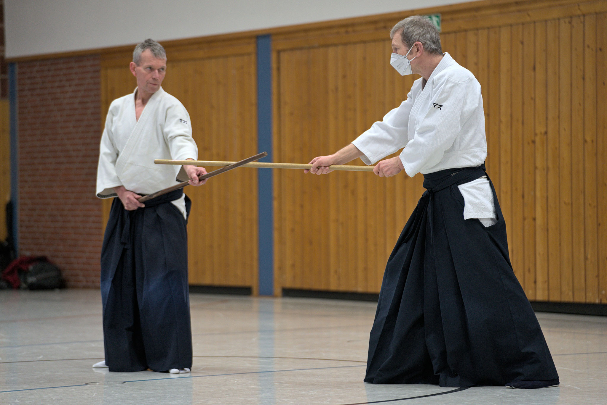 Thomas Domroeß war erfreut, dass ihm alle insgesamt gut folgen konnten und führte dies auf das häufigere Üben mit Stock und Schwert während der Pandemie zurück. Individuell ging er auf die Schwierigkeiten der Kyoträger ein. Auch die tiefgehenden Fragen der DAN-Träger erörterte er ausführlich.